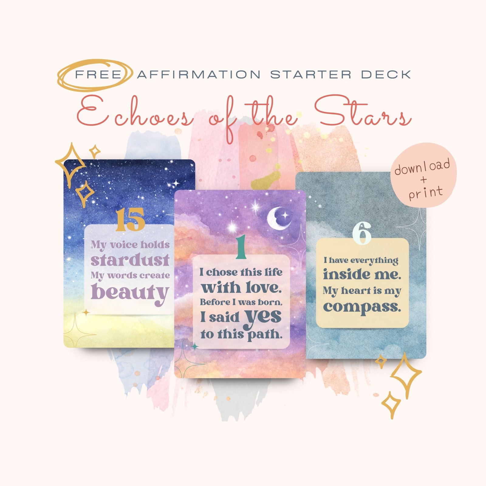 This free set includes six cards from the Echoes of the Stars Affirmation Deck: